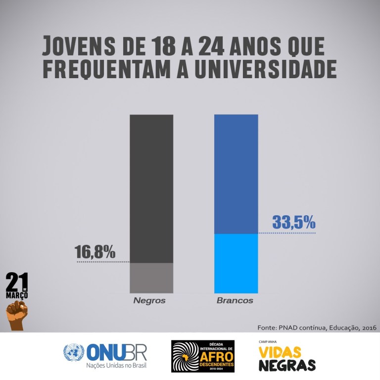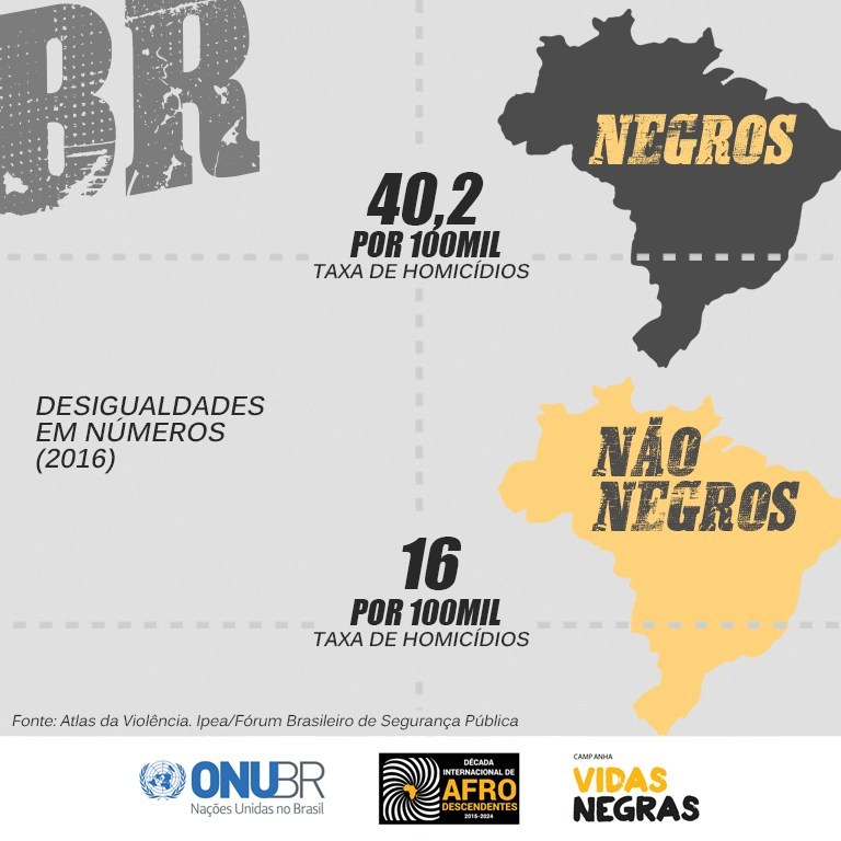 No Brasil, sete em cada dez pessoas assassinadas são negras. Na faixa etária de 15 a 29 anos, são cinco vidas perdidas para a violência a cada duas horas, segundo dados da Nacões Unidas Brasil que, em novembro de 2017, lançou a campanha nacional #VidasNegras. Enquanto reafirma o compromisso para a implementação da Década Internacional de Afrodescendentes, a ONU Brasil convoca toda sociedade e poder público para a urgência em interromper não só o ciclo da violência contra a juventude negra no país, mas, principalmente o seu propulsor: o racismo. A cada 23 minutos, um jovem negro é assassinado. revela o UNICEF, em relatório divulgado recentemente. Se nada for feito: 43 mil brasileiros entre os 12 e os 18 anos serão mortos de 2015 a 2021, revela a organização.